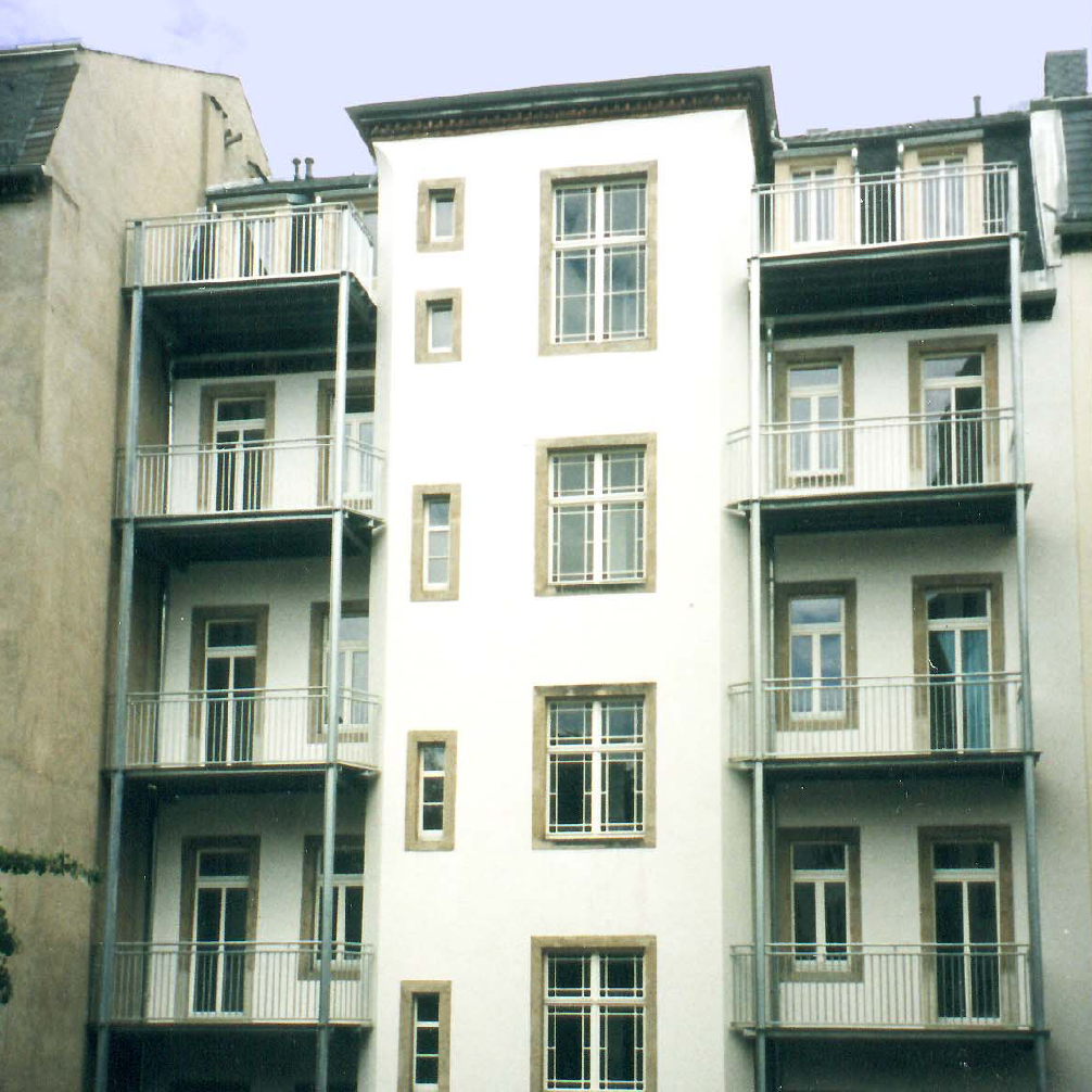 Ein denkmalgeschütztes Mehrfamilien-Stadthaus mit 10 Wohneinheiten in Dresden-Neustadt aus dem Jahre 1880 ist stark sanierungsbedürftig. Bei den Vorarbeiten stellt sich heraus, dass der Dachstuhl und die Decken der oberen Geschosse vom echten Hausschwamm befallen sind. Daher musste eine intensive Hausschwammbekämpfung mit Entfernung bzw. Injektage der befallenen Materialien vorgenommen werden.