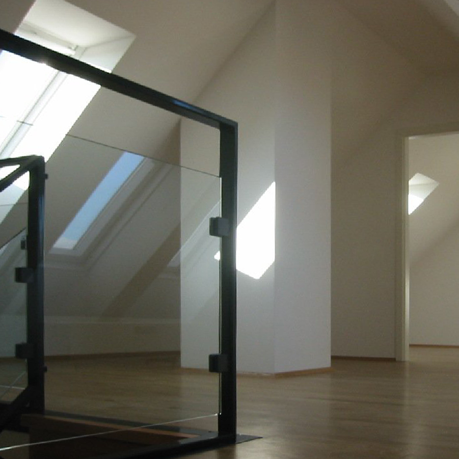 Die Neugestaltung eines insgesamt 75 m langen DG von zwei nebeneinander liegenden Münchner Wohnblocks, Baujahr 1960, brachte eine Reihe von besonderen Herausforderungen mit sich: Die Bestandswohnungen wurden komplett zurück gebaut, um den bislang noch nicht ausgebauten Spitzboden mit eingliedern zu können. Da sämtliche darunter liegenden Wohnungen der fünfgeschossigen Wohnanlage während der gesamten Umbauzeit bewohnt waren, mussten die Baumaßnahmen in allen Phasen so abgestimmt werden, dass eine geringstmögliche Beeinträchtigung der Bewohner erfolgte.
